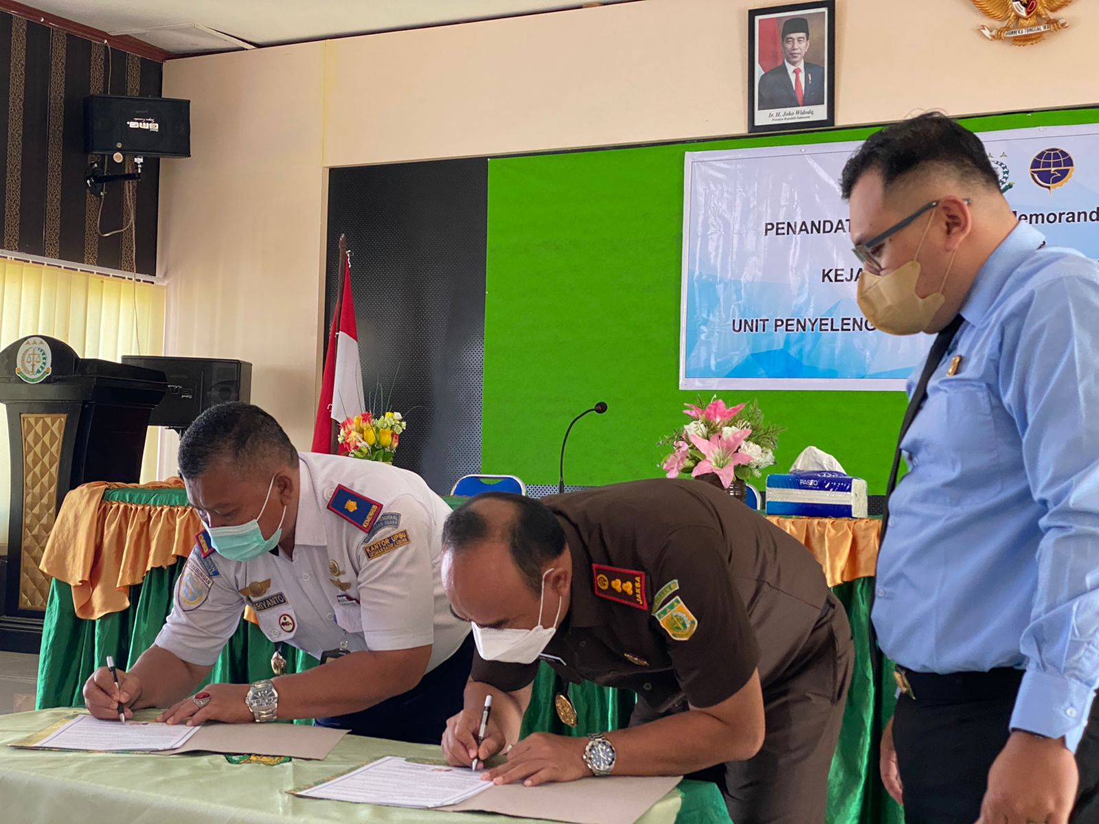 Labuha – Kejaksaan Negeri (Kejari) Halmahera Selatan melaksanakan Penandatangan Memorandum of Understanding (MoU) dengan Unit Penyelenggara Bandar Udara Oesman Sadik Labuha, Selasa (19/04)