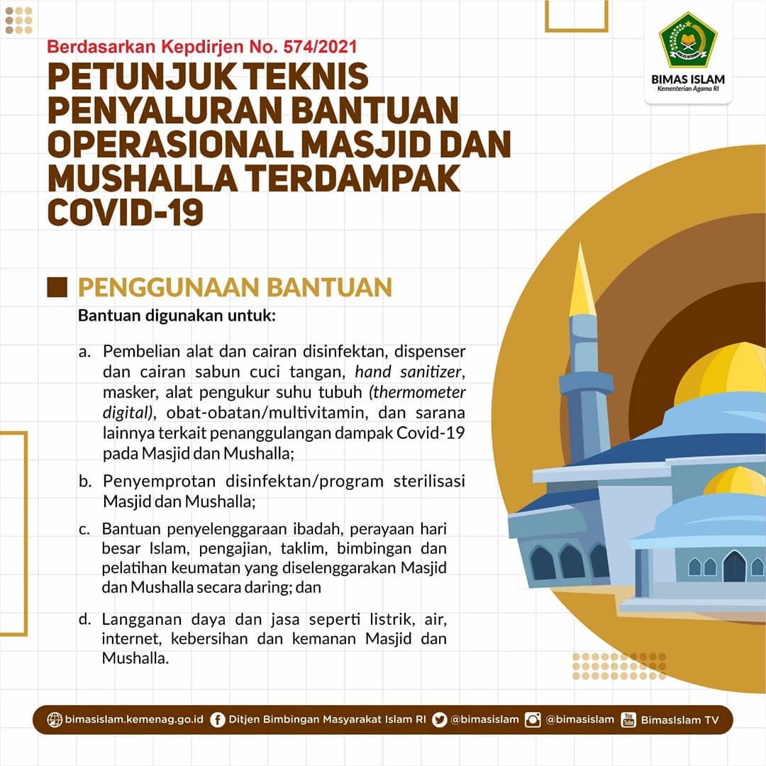 “Misalnya, untuk penyediaan protokol kesehatan 5M seperti penyediaan sanitasi cuci tangan, masker, hand sanitizer, disinfektan, dan alat pengukur suhu tubuh serta sarana pencegahan Covid-19 yang lainnya. Termasuk untuk kebutuhan pembayaran listrik, air, dan kebutuhan pembinaan keumatan yang dilakukan secara daring,” ujar Agus di Jakarta, Sabtu (28/8/2021).