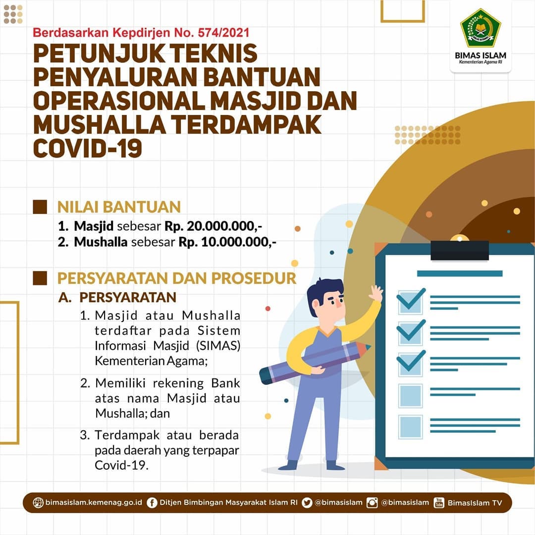 “Salah satu persyaratannya, masjid/musala harus terdaftar pada Sistem Informasi Masjid (SIMAS) Kementerian Agama, memiliki rekening Bank atas nama masjid/musala, dan terdampak/berada pada daerah yang terpapar Covid-19,” ujar Abdul Syukur.