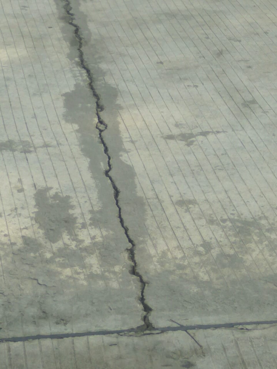 Terlihat dari mulai titik 0 meter di depan gedung Airnav selain ada keretakan terdapat juga bagian beton yang seperti tambalan.