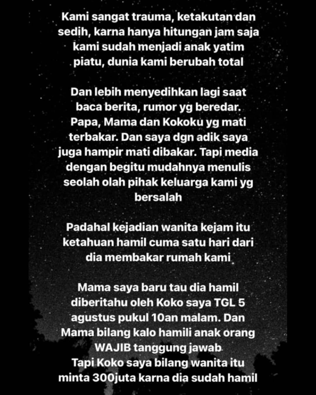 “Tanggal 5 Agustus lalu 1 malam sebelum wanita itu bakar rumah kami, saya ada dengar kalau dia minta Rp 300 juta ke Koko (almarhum Lionardi) karena dia hamil,” ujar Cornelia.