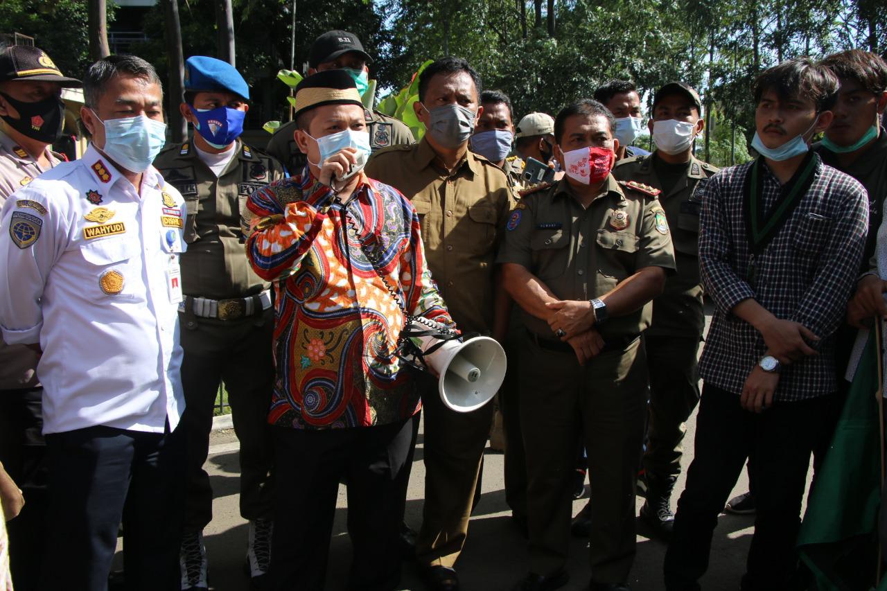 Didepan pintu masuk Pusat Pemerintahan H. Turidi Susanto Wakil Ketua I DPRD dan Kepala Dinas Perhubungan ( Kadishub) Kota Tangerang Wahyudi Iskandar temui Himpunan Mahasiswa Islam ( HMI ) melakukan aksi demo terkait mangkraknya Angkot Si Benteng di Terminal Poris Plawad Kota Tangerang, ( Selasa, 08/12/2020 ).
