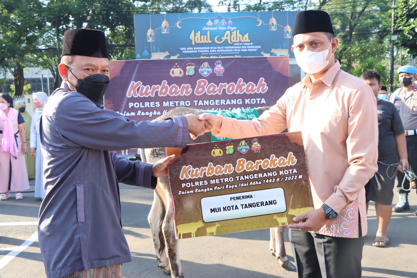 Usai melaksanakan Ibadah Salat Ied Kapolres di dampingi Wakapolres AKBP Bambang Yudhantara Salamun secara simbolis menyerahkan 18 ekor sapi dan 35 ekor kambing kepada panitia kurban di wilayah hukum Polres Metro Tangerang Kota.