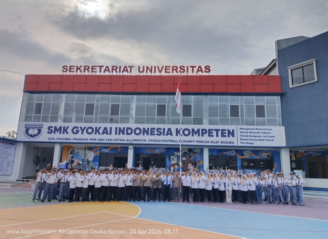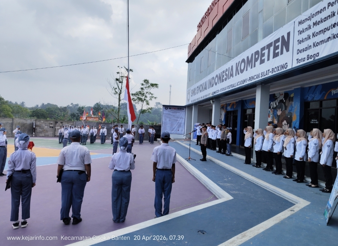 Kabupaten Tangerang – Kapolsek Cisoka IPTU Aditya Surya Sakti, S.Tr.K., M.M, menjadi pembina upacara pengibaran bendera merah putih di SMK Gyokai Indonesia Kompeten di jalan Perum Pesona Wibawa Praja Blok 15/08, Desa Jeungjing, Kecamatan Cisoka, Kabupaten Tangerang, kegiatan ini berlangsung pada pukul 07.00 hingga 07.45 Wib yang dihadiri Kepala Sekolah Kurtubi SE,.MM, beserta Dewan Guru dan personel Polsek Cisoka.“Senin pagi. 20/4/2026