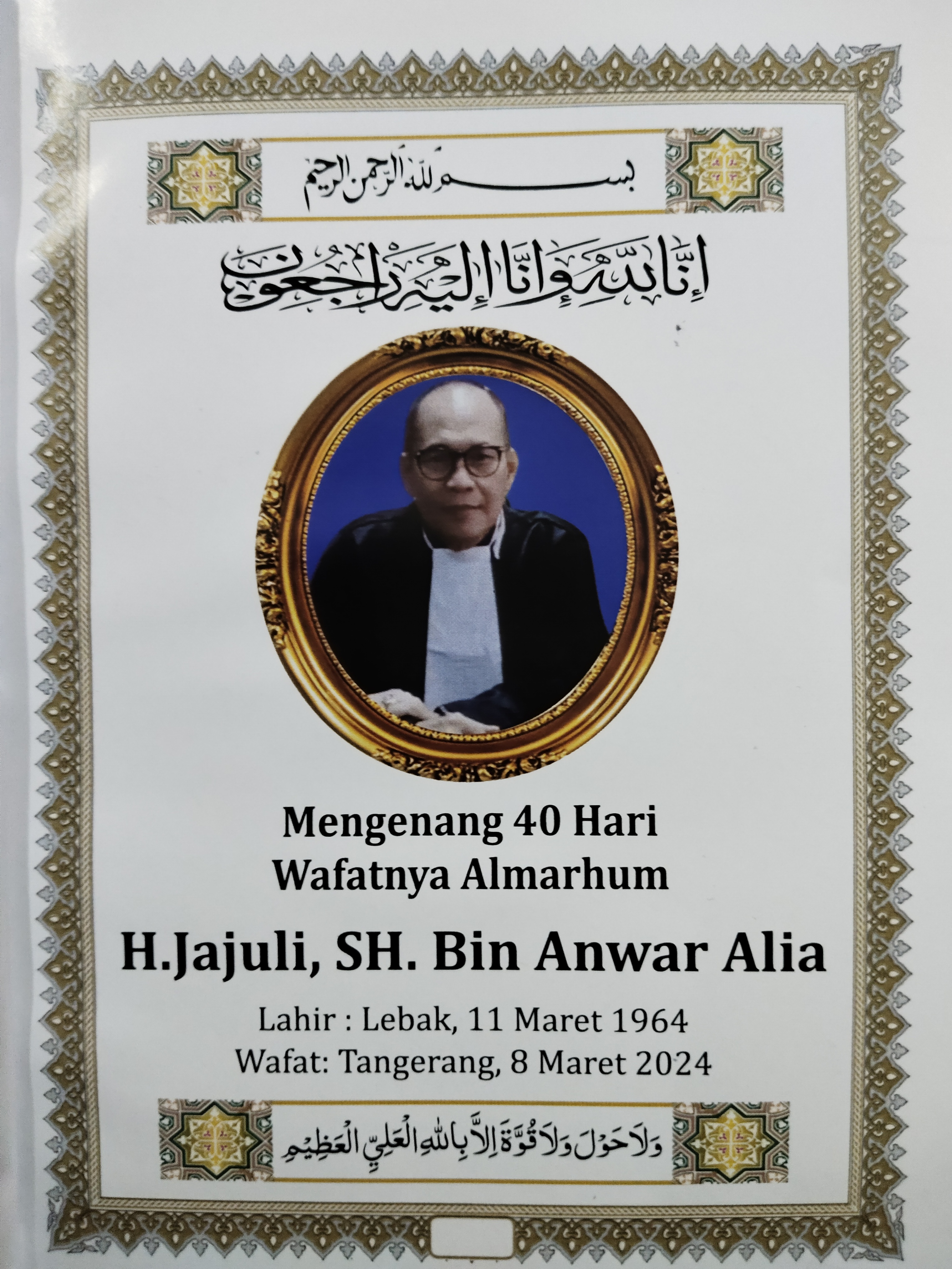 Seperti di salah satu keluarga di kelurahan gerendeng pada rabu (17/4/2024) sore telah di laksanakan kegiatan tahlilan 40 Hari atas meninggalnya Alm H. Jajuli Bin Anwar Alia, seorang pengacara yang wafat pada hari jumat 24 maret 2024 di kota Tangerang.