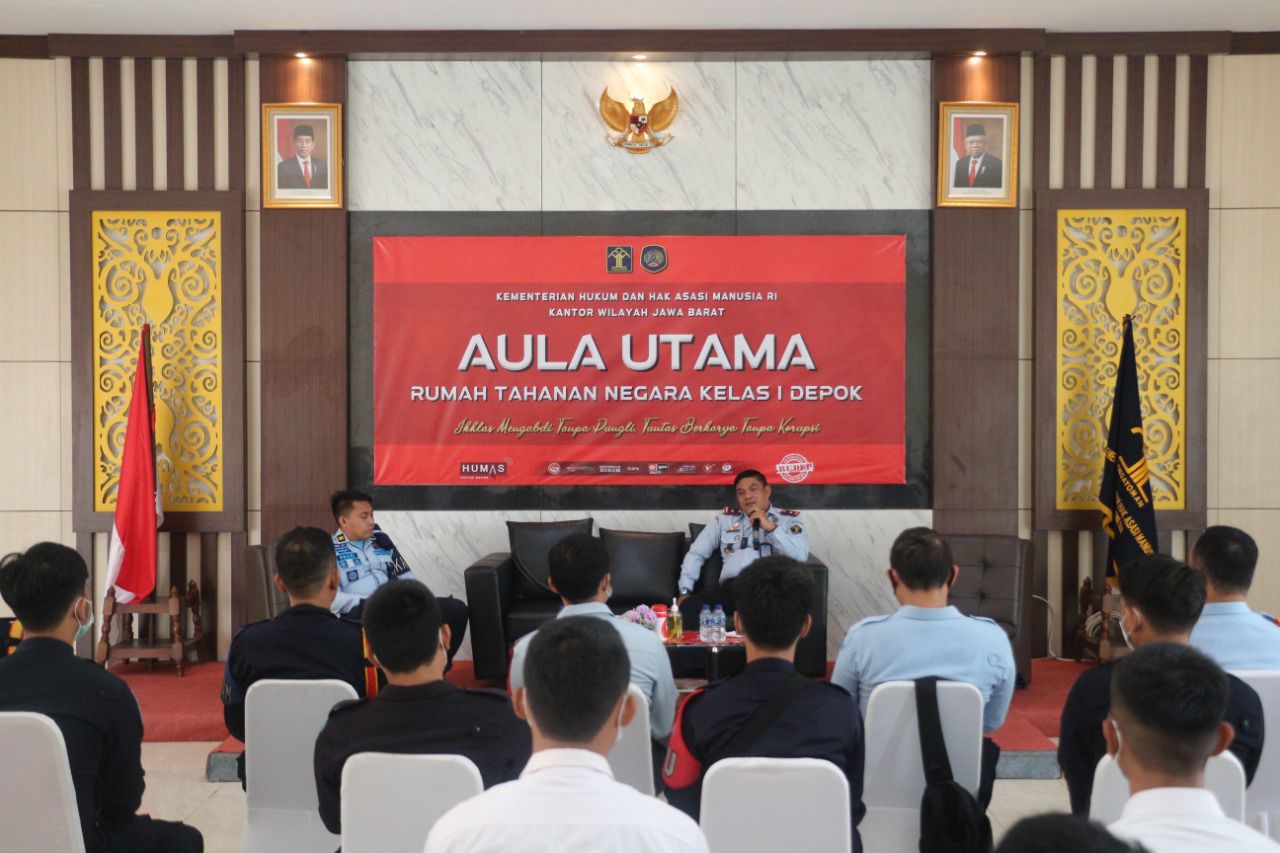 Plt. Kepala Rutan Kelas I Depok, Muhamad Irvan Muayat memberikan Penguatan kepada seluruh jajaran Pengamanan. Kegiatan penguatan yang di konsep seperti kuliah umum ini berjalan dengan aman dan kondusif serta patuh terhadap protokol kesehatan yang ketat, (19/10/21).