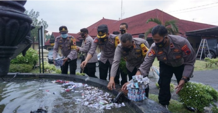 Purbalingga – Petasan hasil sitaan di Kabupaten Purbalingga di musnahkan dengan cara direndam Polres Purbalingga berhasil menyita ribuan petasan berbagai jenis.Petasan tersebut merupakan hasil kegiatan rutin yang ditingkatkan (KRYD) menjelang hari raya Idul fitri 1442 H.barang bukti petasan hasil sitaan itu, dimusnahkan dengan cara direndam dalam kolam di kompleks Mapolres. Tak berhenti di situ, Polres Purbalingga akan terus lakukan penyitaan petasan.