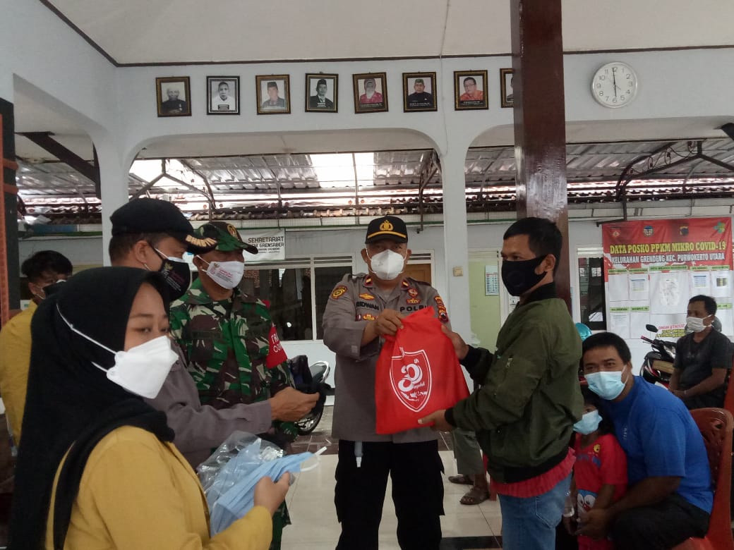 Bekerja sama dengan mahasiswa KKN Unsoed, Polresta Banyumas Polda Jawa Tengah melaksanakan pembagian sembako kepada warga terdampak Covid 19.
