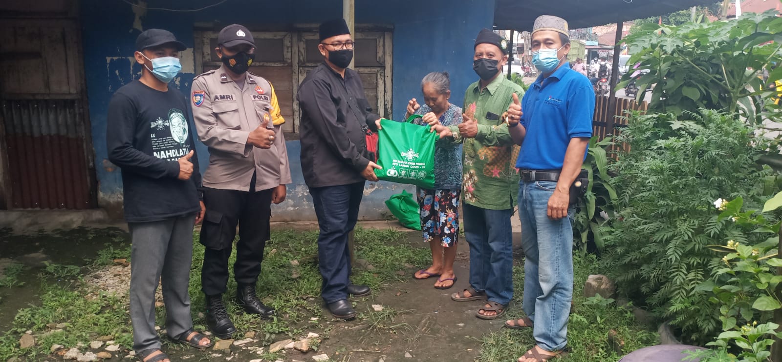 Nampak ikut serta membagikan paket sembako secara door to door, Aipda Amri Bhabinkamtibmas kelurahan Pasar Tanjung Enim, Ust Watoni Wakil Ketua PCNU Kab.Muara Enim , Ujang Simon Satkorcam Banser serta Aidil Koster SE ketua RW02 Talang Gabus(Mahbub)
