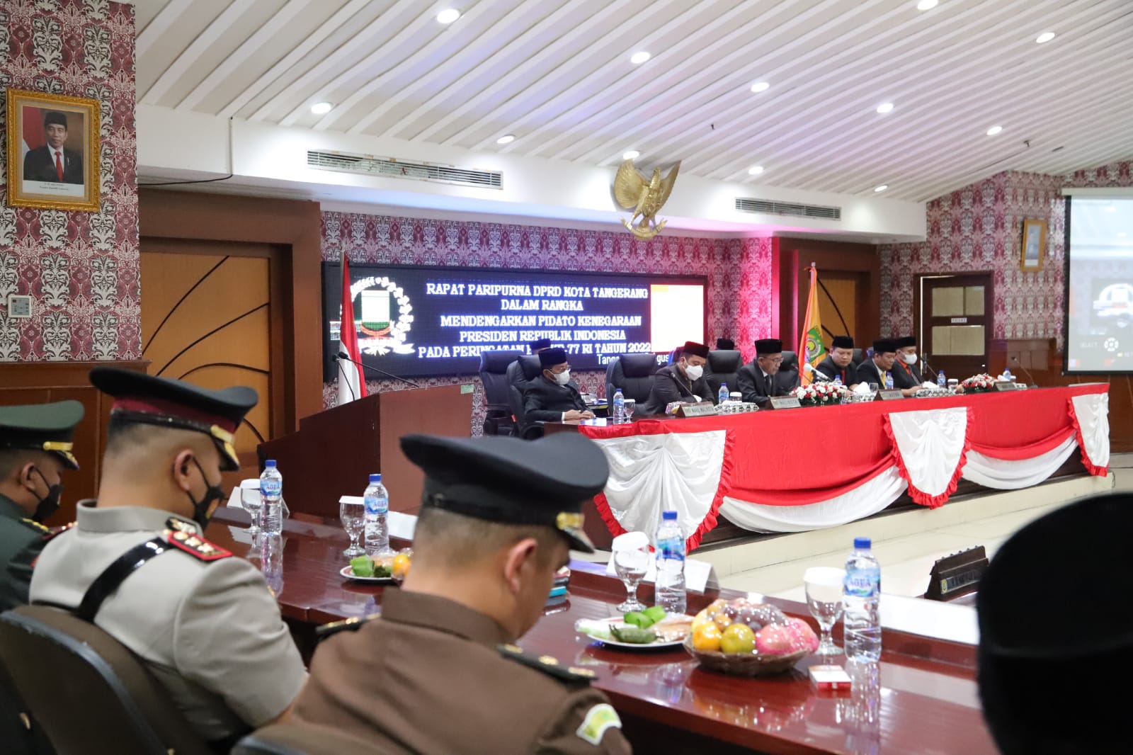 KOTA TANGERANG.Dewan Perwakilan Rakyat Daerah (DPRD) Kota Tangerang menggelar Rapat Paripurna mendengarkan Pidato Kenegaraan Presiden Republik Indonesia, pada Peringatan HUT ke-77 Republik Indonesia, yang berlangsung di Ruang Paripurna Puspem Kota Tangerang, Selasa (16/8/22).