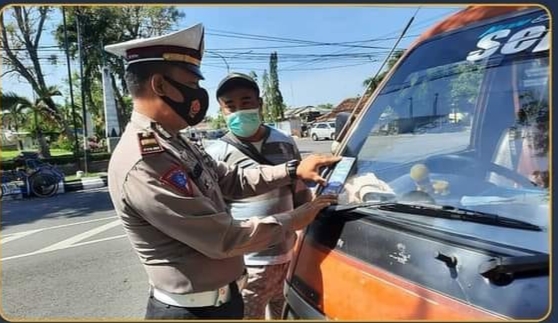 Dalam pelaksanaannya anggota Satlantas Polres Demak memasangkan stiker edukasi di kendaraan umum yang berisi himbauan menerapkan protokol kesehatan seperti menggunakan masker.