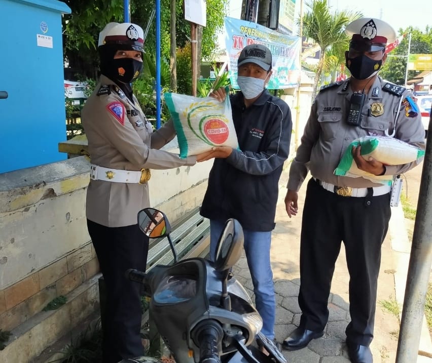 PEKALONGAN – Satuan Lalulintas Polres Pekalongan terus melakukan operasi simpatik dalam Ops Patuh Candi 2021. Salah satunya dengan membagikan paket sembako dan masker kepada warga dan pengguna kendaraan yang sedang melintas di jalan. Tak hanya pengendara motor, petugas juga memberikan paket serupa kepada Pedagang Kaki Lima (PKL) hingga tukang ojek online maupun ojek pangkalan.