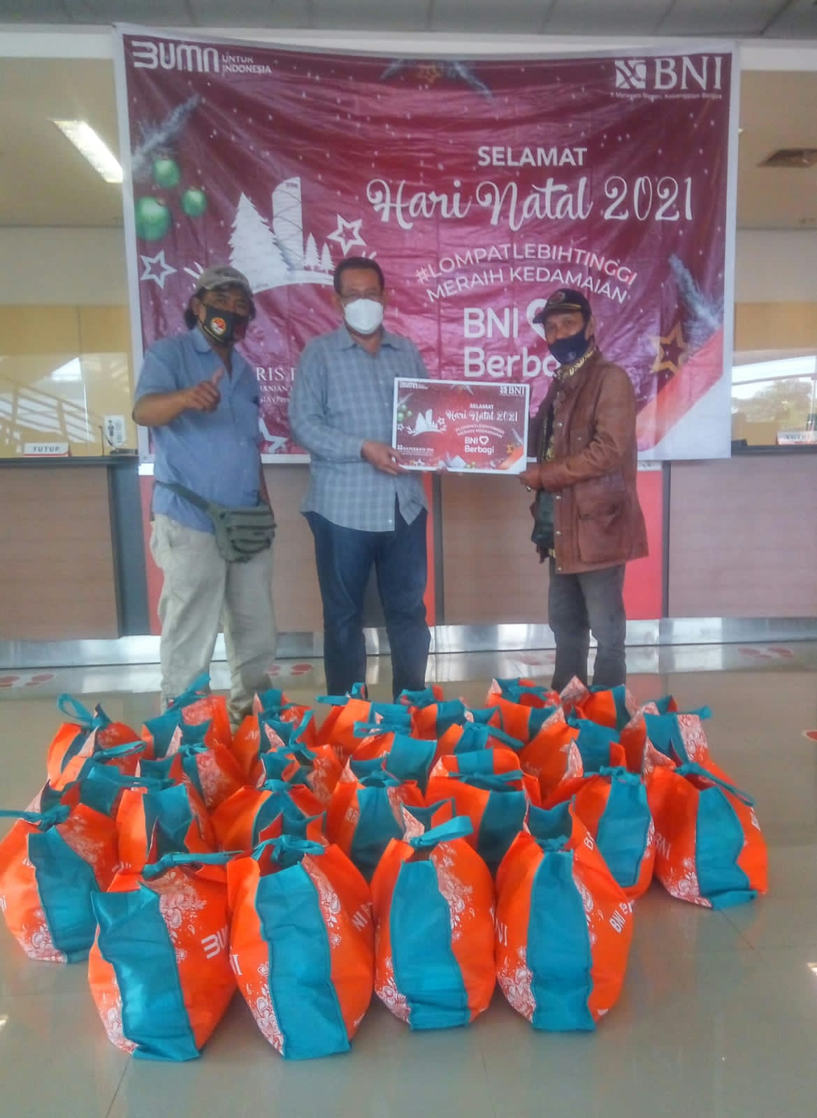 Thema BNI tahun ini adalah: Melompat Lebih Tinggi. “Artinya, disitu ada Spirit. Sekalipun kita saat ini ada dalam masa pandemi. Kita tetap harus memiliki semangat untuk selalu bisa berkarya dan bisa berbagi dengan sesama harapannya, bagi yang merayakan Natal dan Tahun baru, kami berharap dengan adanya bantuan ini semoga bisa menjadi penyemangat untuk bisa tetap menjalani kehidupan dan kita dapat memberikan yang terbaik dan tidak ada hambatan-hambatan kedepannya. Wahudy juga mengucapkan, Selamat hari Natal 2021 dan Tahun Baru 2022, “Merry Christmas and Happy New Year,”