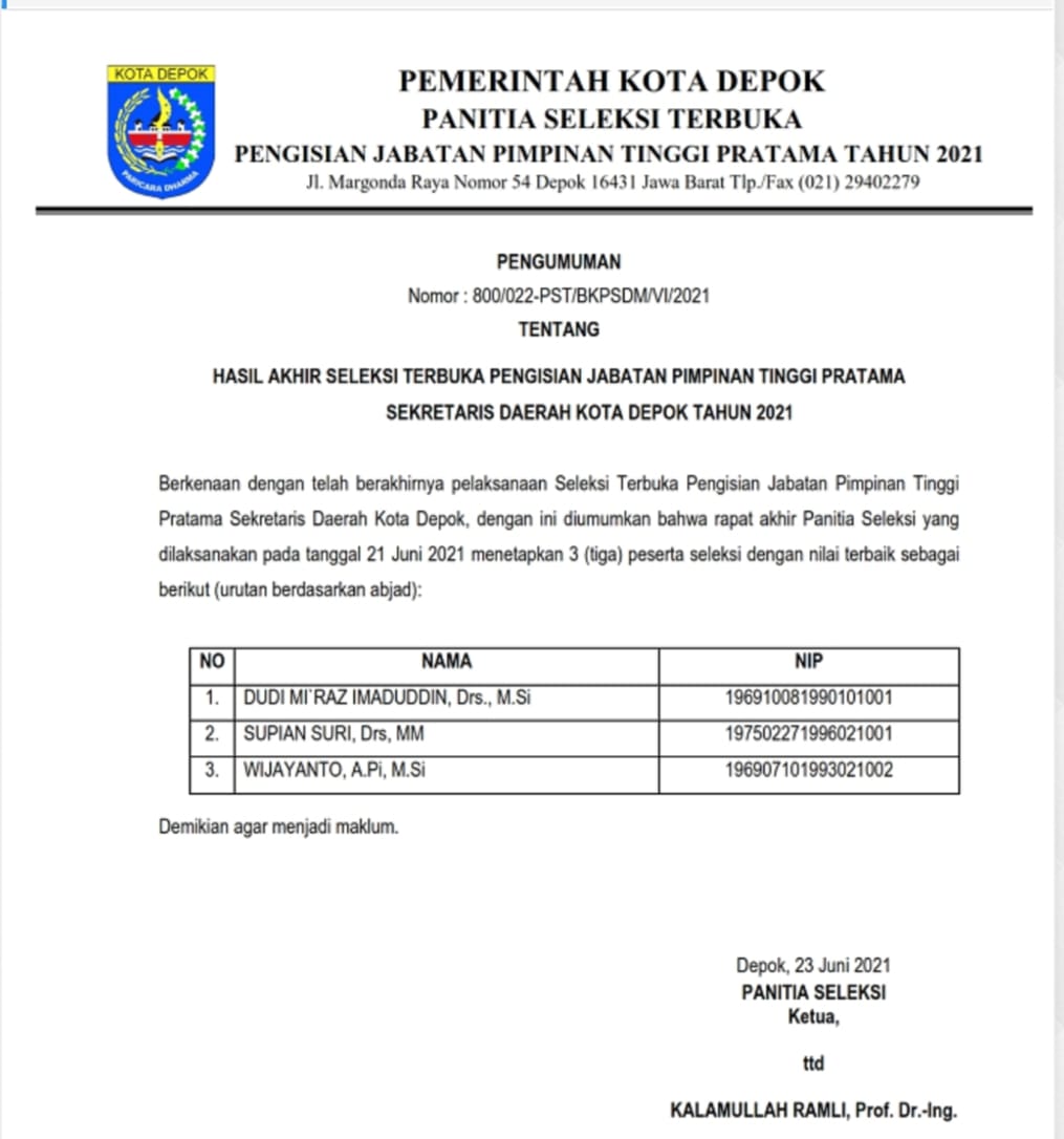 Dengan berakhirnya seleksi terbuka pengisian jabatan Tinggi Pratama Sekretaris Daerah Kota Depok, dengan ini diumumkan, bahwa rapat akhir Panitia Seleksi yang dilaksanakan pada tanggal 21 Juni 2021 menetaptkan tiga peserta seleksi dengan nilai terbaik, sebut Kalamullah Ramli, Panitia Seleksi, Rabu (23/6/2021), dari Hotel Margo City Jln, Margonda