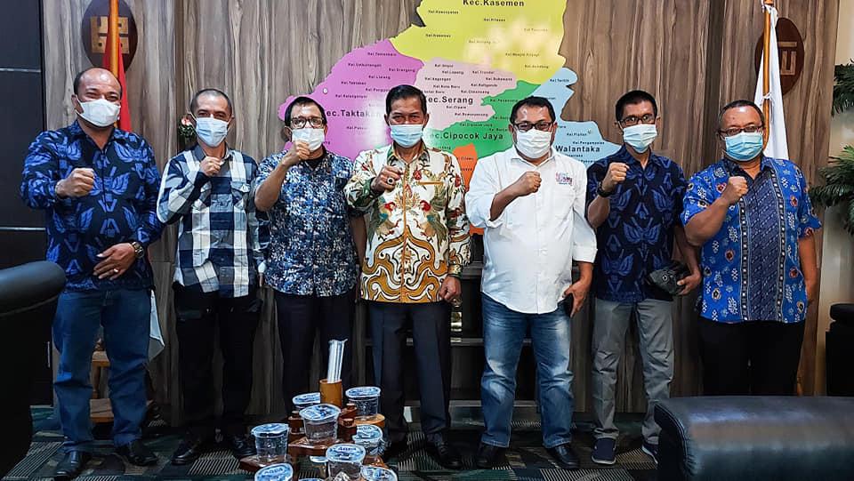 Ketua Umum SMSI Firdaus yang didampingi Ketua Dewan Pakar SMSI yang juga Wakil Ketua Dewan Pers Hendry Ch Bangun, Ketua Departemen Organisasi dan Daerah SMSI Pusat Andi Setiadi sekaligus sebagai Koordinator Bhakti Sosial Pembangunan Jalan Panitia HPN 2021, Humas SMSI Pusat Izaac M Tulalessy, Ketua SMSI Provinsi Banten Lesman Bangun dan Ketua Bidang Organisasi SMSI Provinsi Banten Sahatma Refindo menemui Wali Kota Serang Syafrudin di ruang kerjanya, Jumat (22/1/2021).
