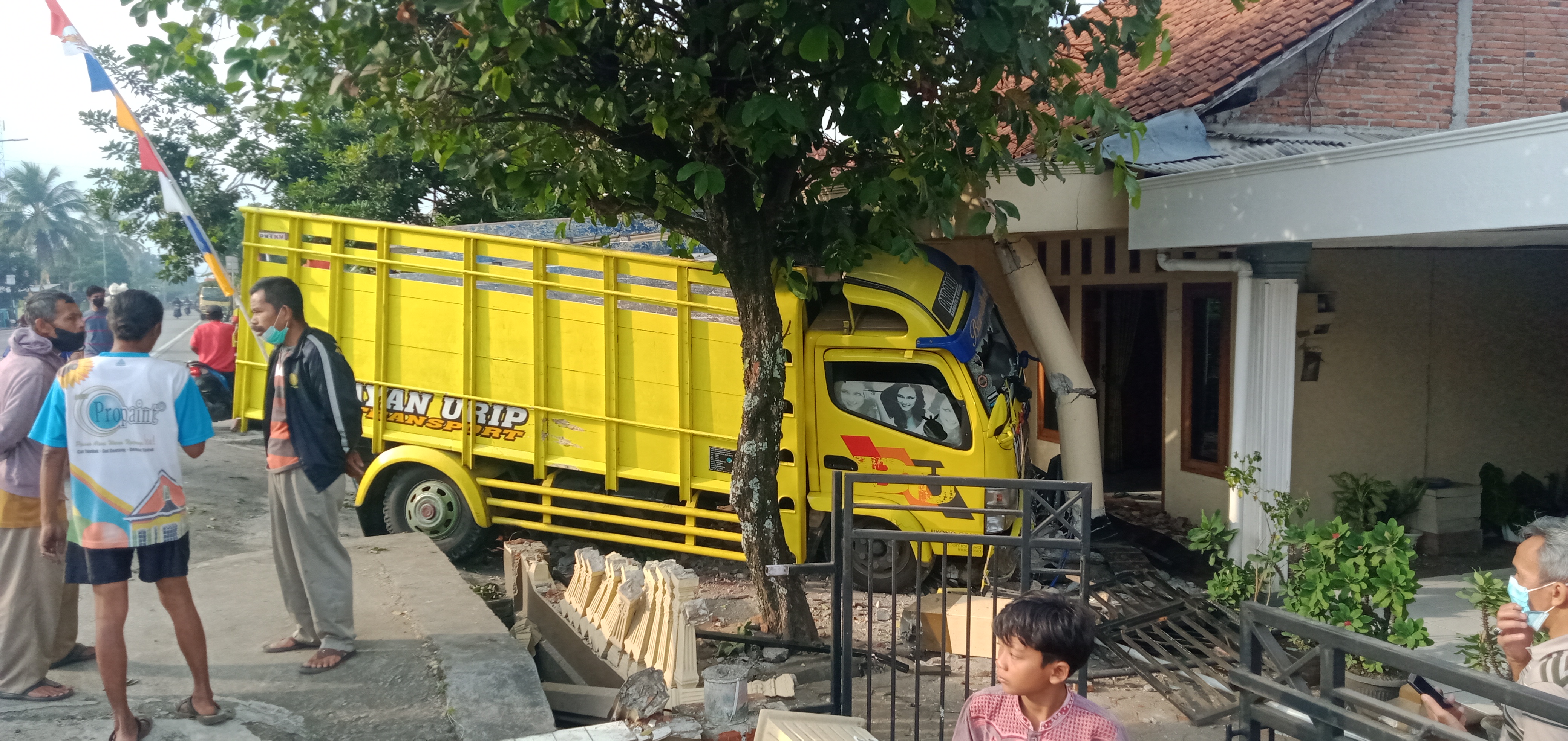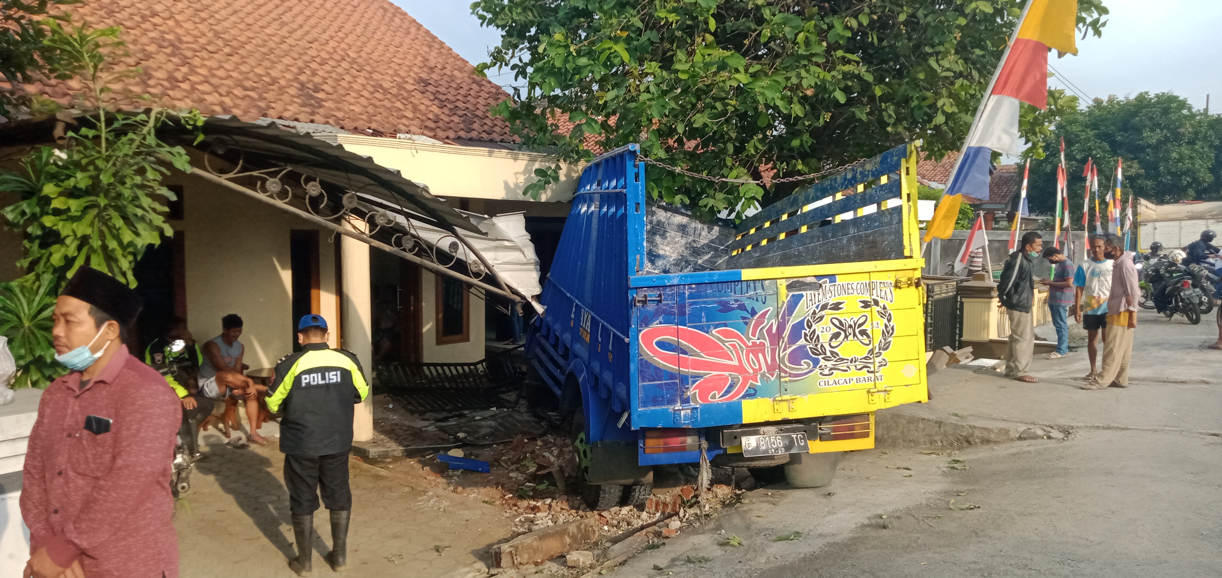 “Awalnya Saya lagi Tidur, tiba-tiba ada suara seperti ban pecah, begitu dilihat posisi truk itu sudah ada di depan rumah,” kata Sri Indrawati Selasa 24 Agustus 2021. Sri Indrawati mengatakan, truk bernomor polisi G 8156 TG ini melaju kencang dari arah Yogyakarta Lewat Klapa Gading Wangon menuju Majenang. Beruntung, keluarga Sri Indrawati Klapa Gading RT 4 RW 3 Kecamatan Wangon Kabupaten Banyumas yang tengah berada dalam rumah tidak mengalami luka-luka.